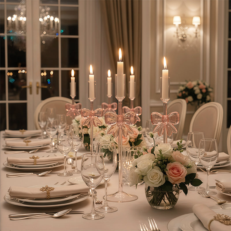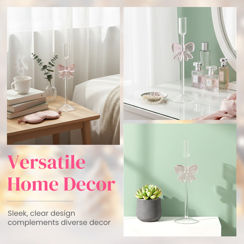 ELEGANT BOW DESIGN: Adorn your space with whimsical sophistication. The meticulously crafted pink bow, seamlessly integrated into clear glass, provides a charming focal point. This delicate detail elevates the candle holder from a simple accessory to a statement piece, adding warmth and character to any room or occasion, reflecting refined taste.